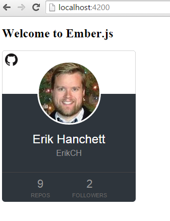 Polymer components look similar to Ember components without the curly braces when you add them to your template files. To display the Github card we'll add this line to our application.hbs file. The user is the Github profile you would like the card for.