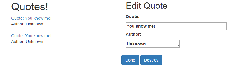 We added in some simple bootstrap and we've now made each quote a link to our new edit template. You'll notice the outlet at the bottom. This is where our edit template will be displayed.